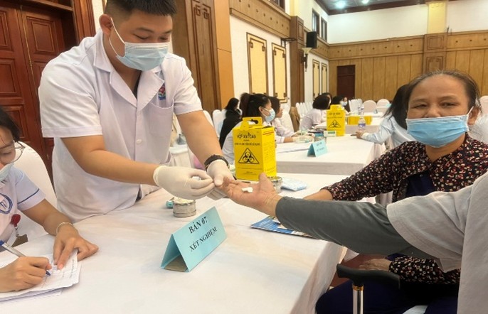Người dân cán bộ y tế được test đường huyết mao mạch và khám bệnh